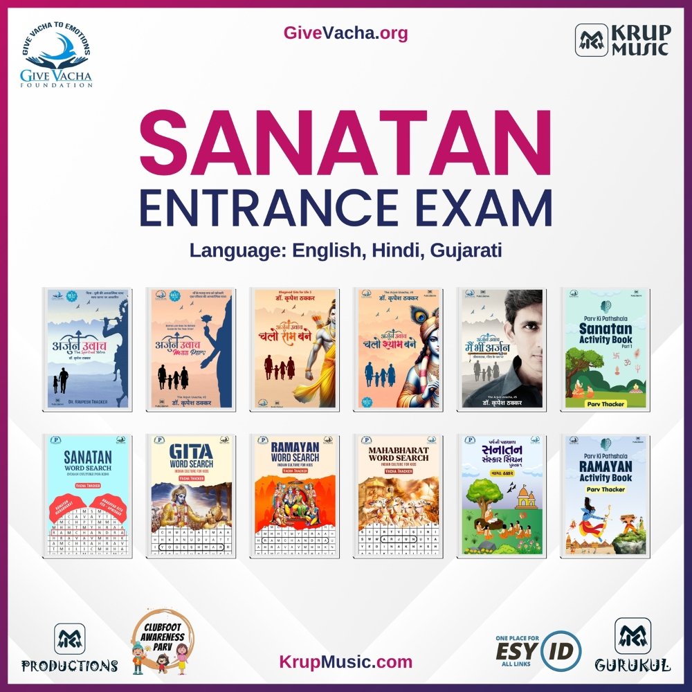 Sanatan Entrance Exam is a pioneering initiative by the Give Vacha Foundation and Krup Music, in collaboration with Krup Gurukul, Esy ID, and Krup Productions, designed to immerse participants in the profound world of Indian culture. This exam serves as the first step toward exploring the vast ocean of timeless wisdom enshrined in sacred texts like the Ramayana, Mahabharata, Shrimad Bhagavat Puran, Bhagavad Gita, Vishnu Puran, Shiv Puran, and other revered scriptures.