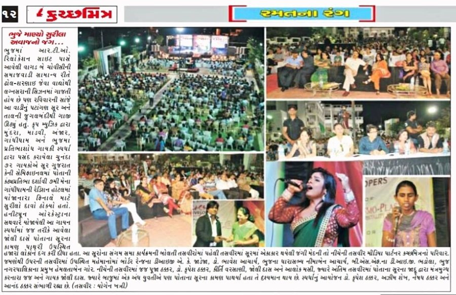 ભુજમાં આર.ટી.ઓ. રિલોકેશન સાઇટ પાસે આવેલી વાગડ બે ચોવીસીની સમાજવાડી સામાન્ય રીત ઢોલ-શરણાઈ જેવા વાદ્યો લગ્નસરાની સિઝનમાં ગાજતી હોય છે પણ રવિવારની સાજે આ વાડીનું પટાંગણ સૂર અને તાલની જુગલબંદીથી ગાજી ઉઠયું હતુ. કૂપ મ્યુઝિક દ્વારા મુન્દ્રા, માંડવી, અંજાર, ગાંધીધામ અને ભુજમાં પ્રતિભાશોધ ગાયકી સ્પર્ધા દ્વારા પસંદ કરાયેલા ચુનંદા ૭ર ગાયકોએ સૂર ગુજરાત કેની સેમિહાઇનલમાં પોતાની કંઠયપ્રતિભા દર્શાવી ૭મી મેના ગાંધીધામની રેડશિન હોટલમાં યોજાનારા ફિનાલે માટે સુરીલો દાવો ઠોકયો હતો. હનીટયુન ઓરકેસ્ટ્રાના સથવારે યોજાયેલી આ ગાયન સ્પર્ધામાં જજ તરીકે આવેલા જોલી દાસે પોતાના સુરના કામણ પાથરી ઉપસ્થિત હજારો લોકોને દગ કરી દીધા હતા. આ સૂરોના સંગમ સમા કાર્યકમની બોલતી તસવીરોમા પહેલી તસવીરમાં સૂરમાં એકાકાર થયેલી જંગી મેદની તો નીચેની તસવીર મીડિયા પાર્ટનર કચ્છમિત્રનો પરિવાર. જમણેથી ઉપરની તસવીરમાં ઉપસ્થિત મહમાનોમાં બોર્ડેર રેન્જના ડીઆઇજી એ. કે. જાડેજા, ડો. ભાવેશ આચાર્ય, ભુજના ધારાસભ્ય નીમાબેન આચાર્ય, બી એસ.એફ.ના ડી.આઇ.જી. ભડોલા, ભુજ નગરપાલિકાના પ્રમુખ હેમલતાબેન ગોર. નીચેની તસવીરમાં જજ પૂજાબેન ઠકકર, ડો. કૃપેશ ઠકકર, કીર્તિ વરસાણી, જોલી દાસ અને આલોક મસી, જયારે અંતિમ તસવીરમાં પોતાના સૂરના જાદુ દ્વારા મંત્રમુગ્ધ કરનારા જજ અને ગાયક જોલી દાસ. જયારે બાજુમાં એક અંધ યુવતીએ પણ પોતાના સૂરના કામણ પાથર્યા હતા તે દ્રશ્યમાન થાય છે. સ્પર્ધાનું આયોજન ડો. કૃપેશ ઠક્કર, આઝીમ શેખ, નેષધ ઠકકર અને આનંદ ઠકકર સંભાળી રહ્યા છે.