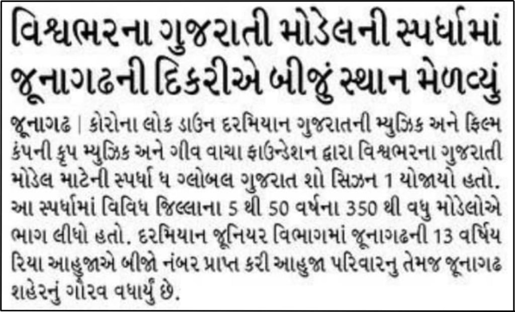 જૂનાગઢ | કોરોના લોક ડાઉન દરમિયાન ગુજરાતની મ્યુઝિક અને ફિલ્મ કંપની કૃપ મ્યુઝિક અને ગીવ વાચા ફાઉન્ડેશન દ્વારા વિશ્ષભરના ગુજરાતી મોડેલ માટેની સ્પર્ધા ધ ગ્લોબલ ગુજરાત શો સિઝન 1 યોજાયો હતો. આ સ્પર્ધામાં વિવિધ જિલ્લાના 5 થી 50 વર્ષના 350 થી વધુ મોડેલોએ ભાગ લીધો હતો. દરમિયાન જૂનિયર વિભાગમાં જૂનાગઢની 13 વર્ષિય રિયા આહુજાએ બીજો નંબર પ્રાપ્ત કરી આહુજા પરિવારનુ તેમજ જૂનાગઢ શહેરનું ગૌરવ વધાર્યું છે.